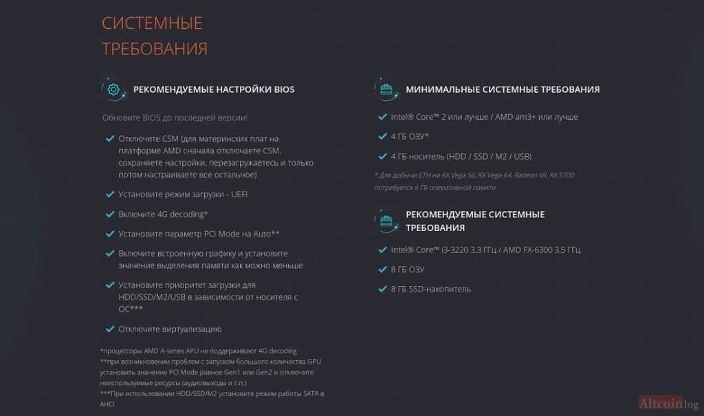 Для майнинга криптовалюты Ethereum, и некоторых других монет, нужны видеокарты с объемом памяти от 6 ГБ. На четырехгиговках эфир уже давно не майнят. В качестве жесткого диска рекомендуется использовать SSD-накопитель объемом от 32 ГБ, это позволит беспрепятственно проводить RaveOS обновление. Суммарная мощность блоков питания должна быть на 10-15% общего потребления фермы.