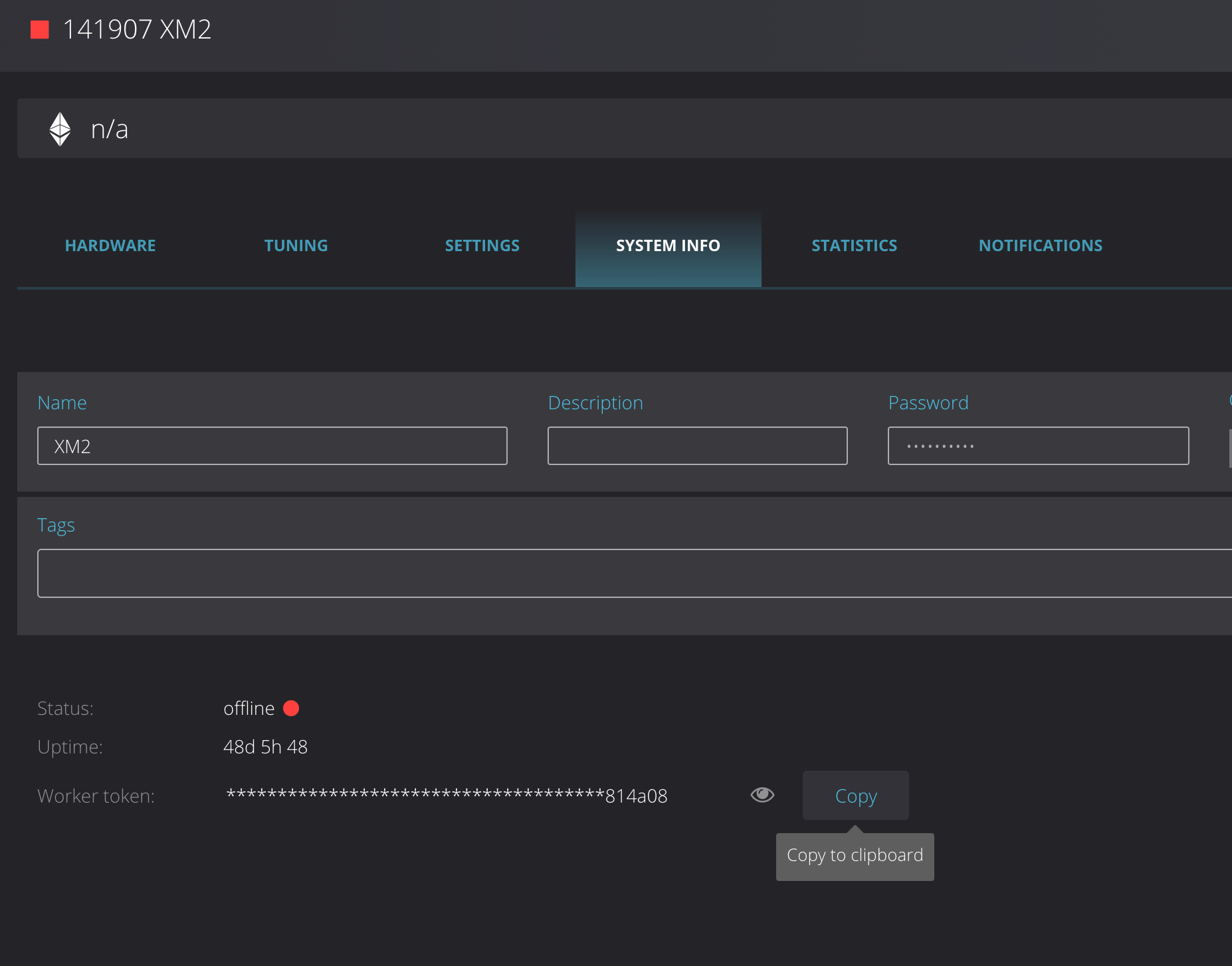 Следующий шаг — копирование токена воркера, который указан в пункт информации о системе. На скриншоте ниже он находится в нижней части.
