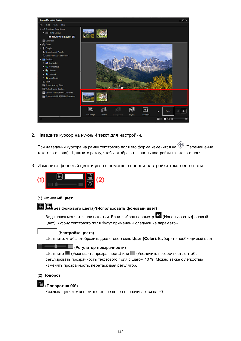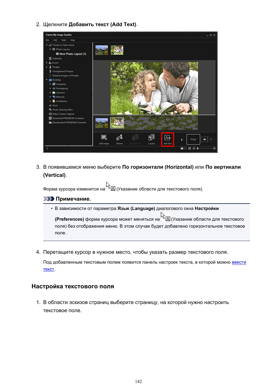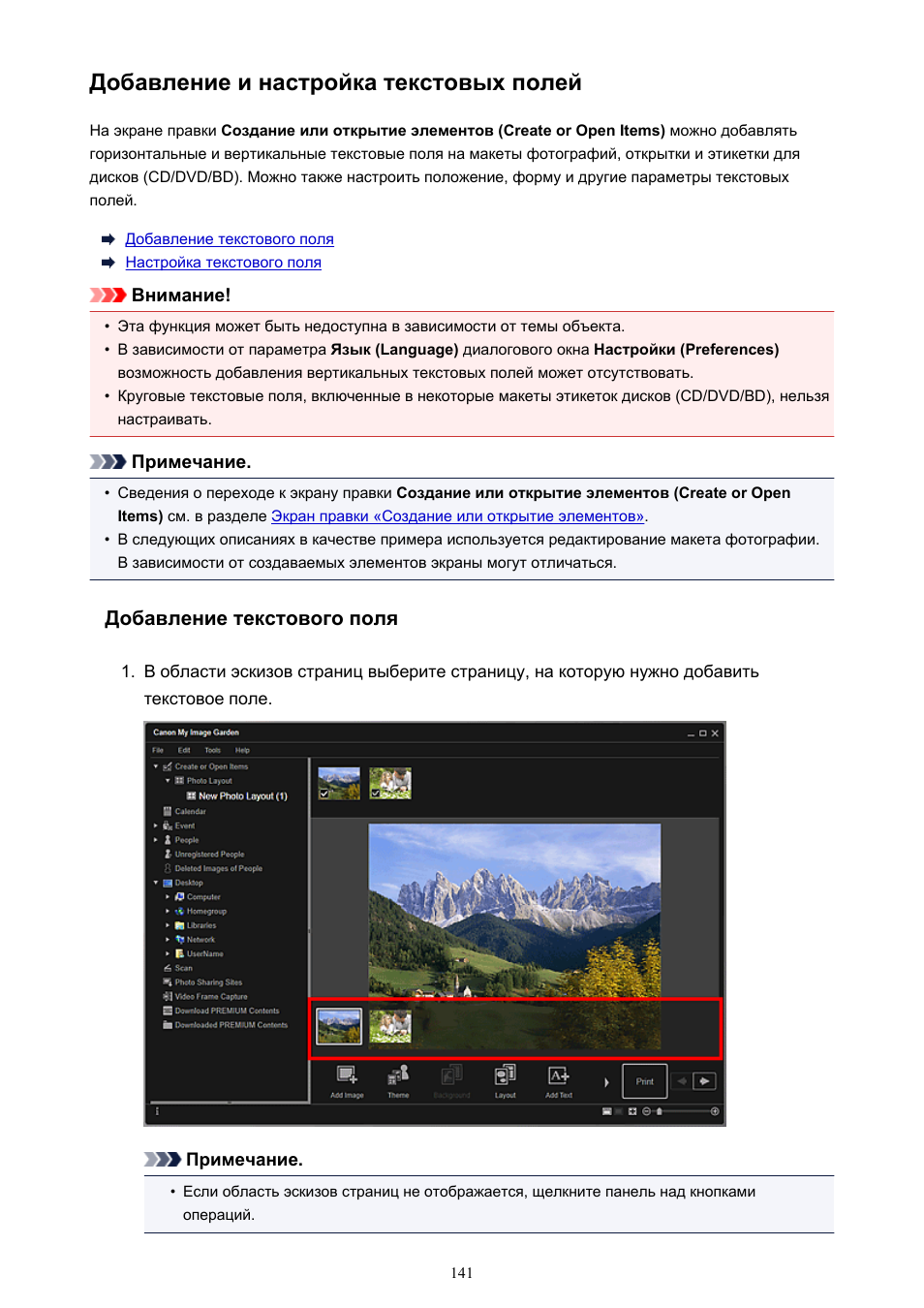 На экране правки Создание или открытие элементов (Create or Open Items) можно добавлятьгоризонтальные и вертикальные текстовые поля на макеты фотографий, открытки и этикетки длядисков (CD/DVD/BD). Можно также настроить положение, форму и другие параметры текстовыхполей.