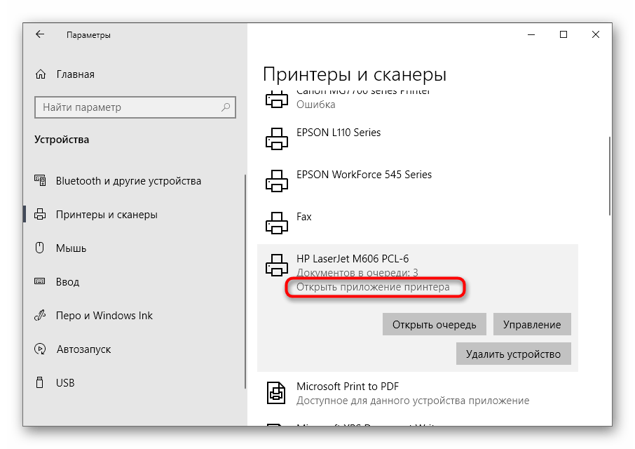 Найдите устройство, для которого хотите настроить печать без полей, и кликните по нему для отображения меню.