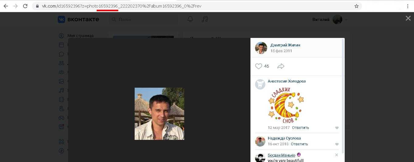 - когда откроется изображение, в адресной строке браузера появится строка, в которой сразу после слова photo и до знака нижнее подчёркивание «_» будет доступен ID-номер.