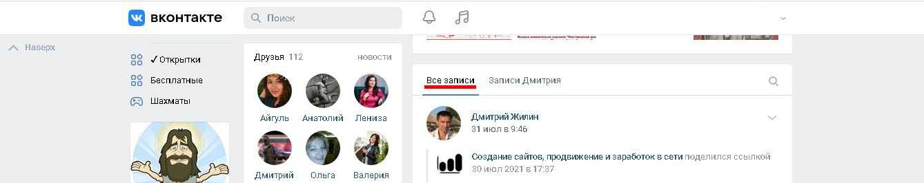 Если пользователь ВКонтакте, ID которого нужно узнать не загрузил главную фотографию, то нужно зайти в его профиль, в том месте, где начинается лента новостей, находим ссылку «Все записи» и кликаем по ней.