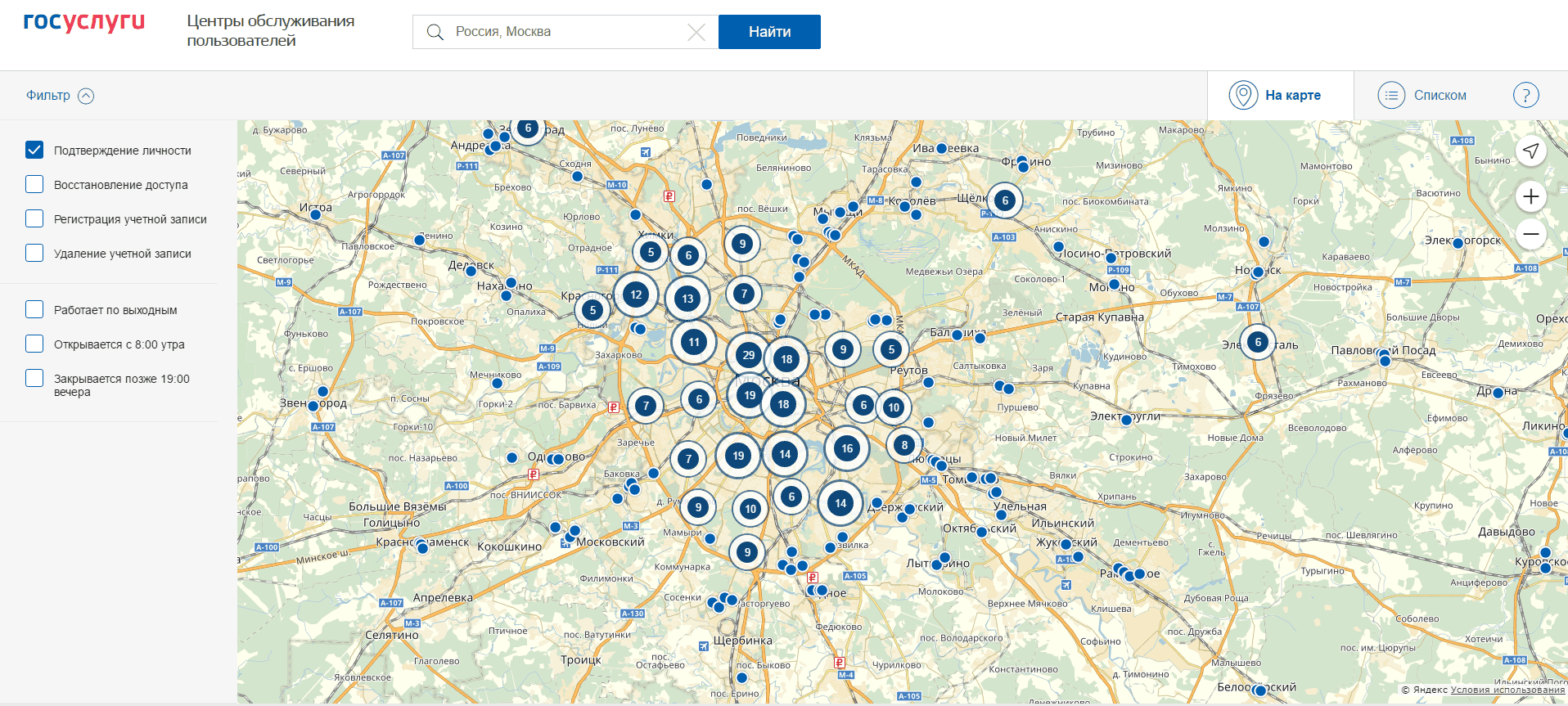 Находим на карте ближайший центр обслуживания. При помощи фильтра можно выбрать интересующую услугу. Вам будет предоставлена информация о часах работы, в которые можно получить пароль активации учетной записи.
