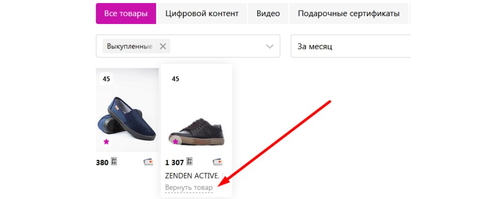 - Щелкнуть на «Покупки» и выбрать товар для возврата.