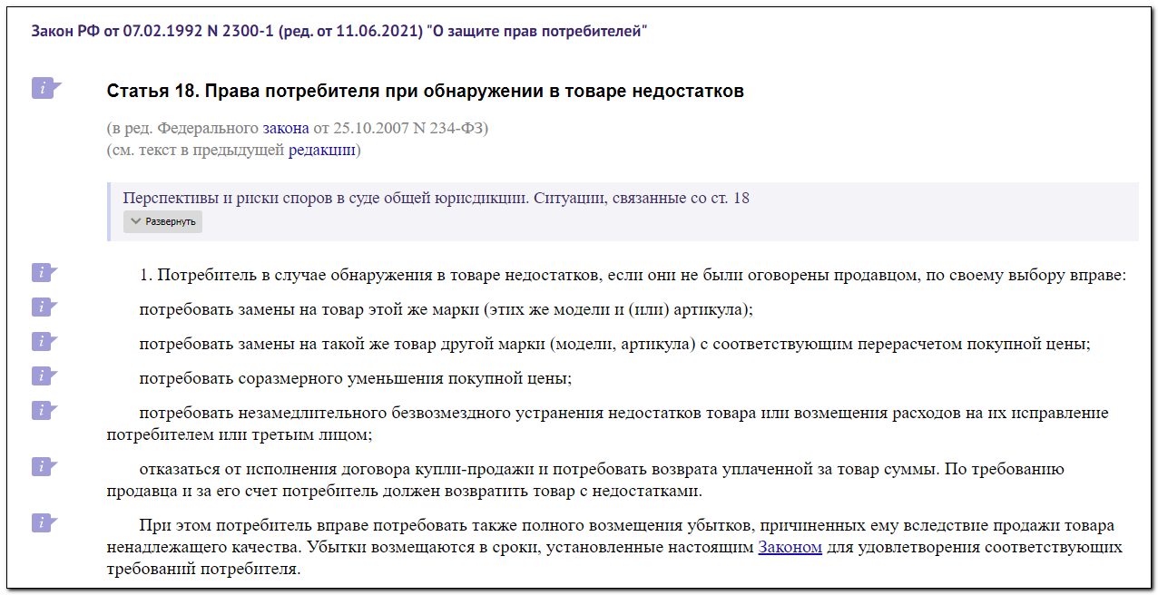 В России действует закон «О защите прав потребителей». Именно этот документ дает возможность отказываться от покупок, и возвращать их продавцу. Однако в нем обозначено несколько ситуаций, когда вернуть товары, а значит, и получить деньги за них не получится: