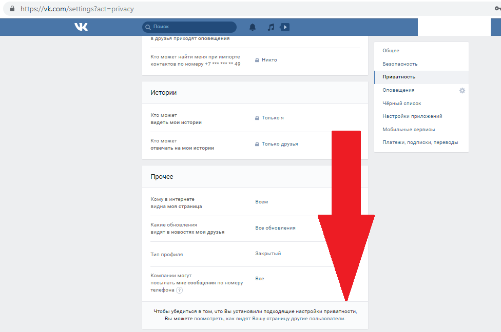 Опустите страницу в самый низ. Здесь вы увидите надпись: «Чтобы убедиться в том, что Вы установили подходящие настройки приватности, Вы можете посмотреть, как видят Вашу страницу другие пользователи». Кликните по ней.