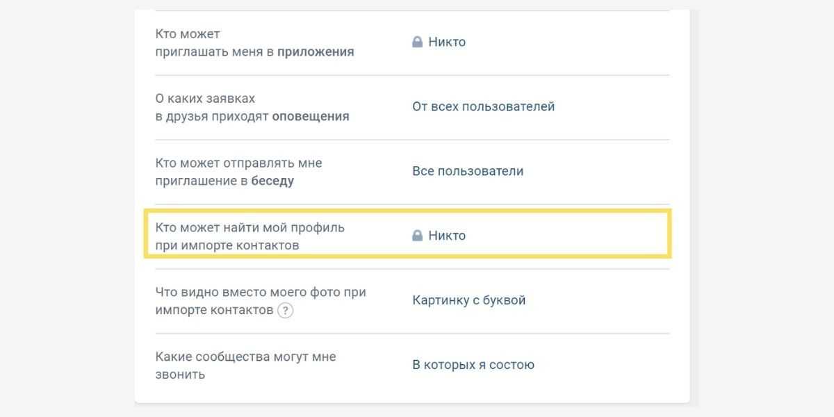 - Выберите настройки в пункте «Кто может найти мой профиль при импорте контактов»: никто, друзья друзей или все, кроме выбранных аккаунтов.