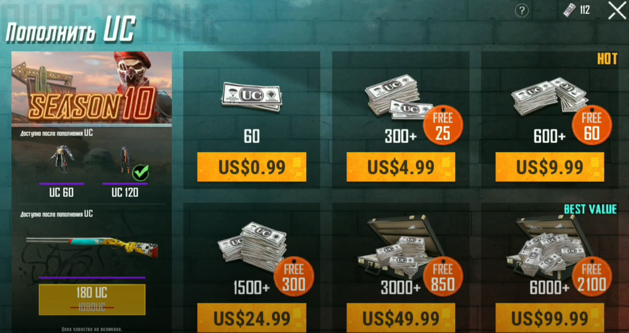 Изначально вы можете пополнить игровой счет из самой PUBG Mobile. Для этого вам нужно будет перейти в раздел игровой валюты и выбрать необходимое количество долларов, которые вы готовы отдать за UC. Сумма, которую вы потратите, будет списана с вашего мобильного счета.