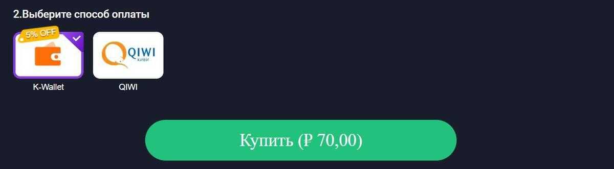 5. В качестве метода оплаты выберите K-Wallet или другой метод оплаты и нажмите на зеленую кнопку с надписью «Купить».