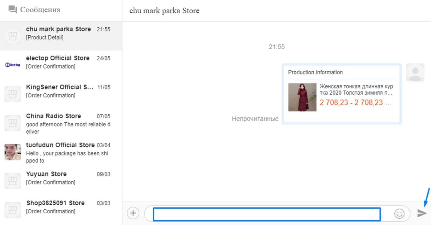 - Написать продавцу в открывшемся чате, вид которого идентичен чату, активированному с раздела описания товара.