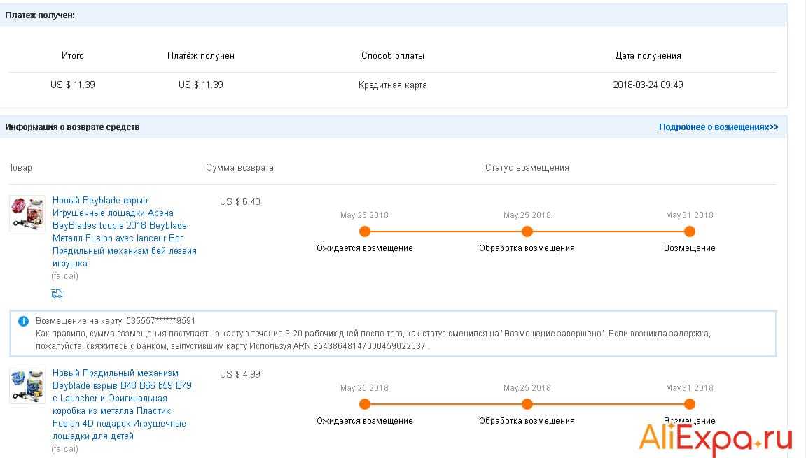 После окончания процедуры возврата денег на страничке данные о заказе можно просмотреть весь ход движения средств: