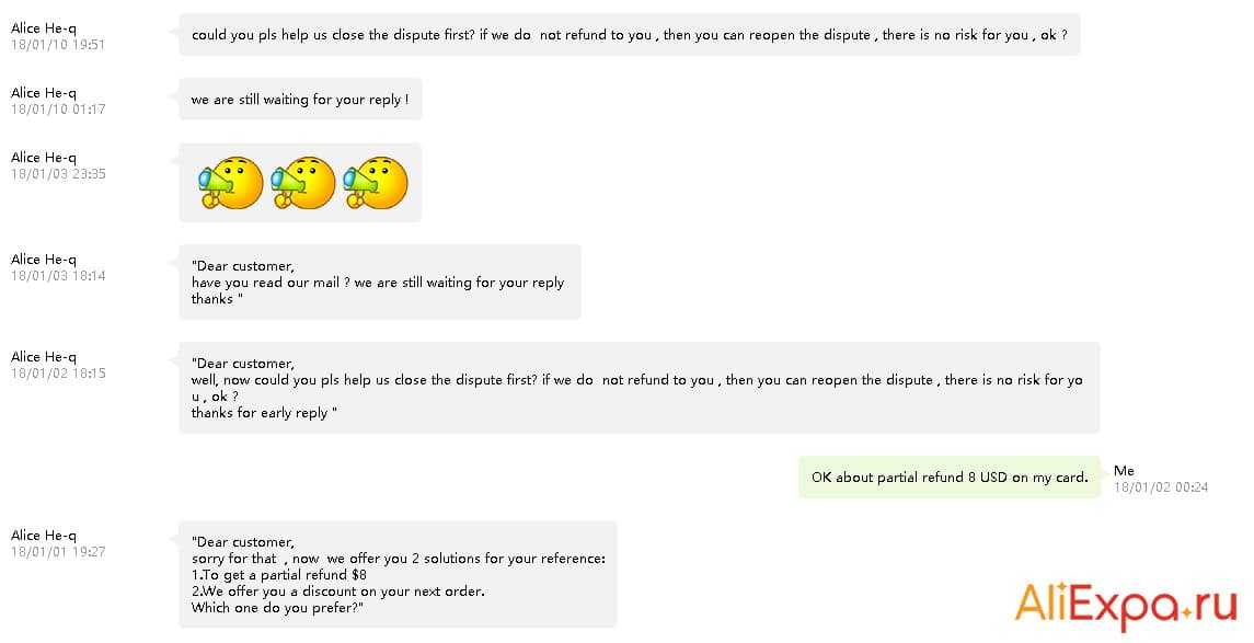 Проблемный заказ на Алиэкспресс можно обсудить только в Споре. Если у вас есть шанс вернуть свои деньги через спор, то воспользуйтесь лучше этим способом.