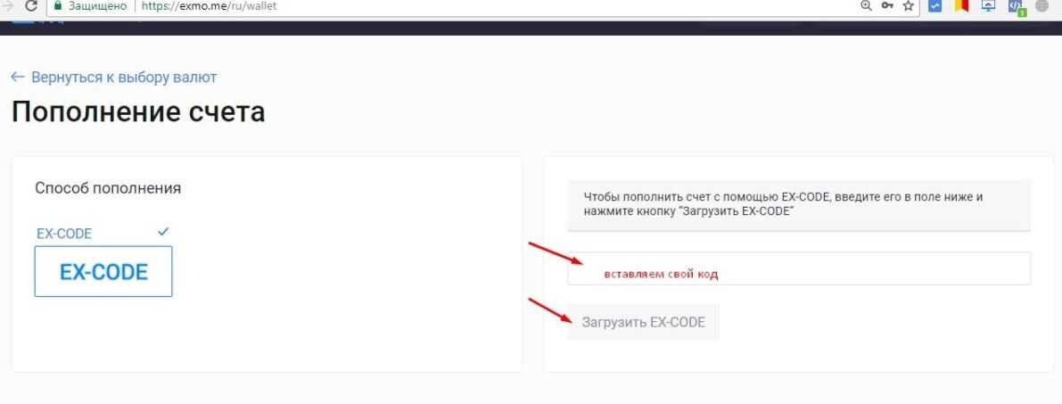 Самый лучший способ пополнения баланса без процентов это EX-CODE (инструкция), специальный код который вы получаете в обмен на рубли в обменниках, после вводите его на сайте биржи Эксмо, как на скриншоте ниже.