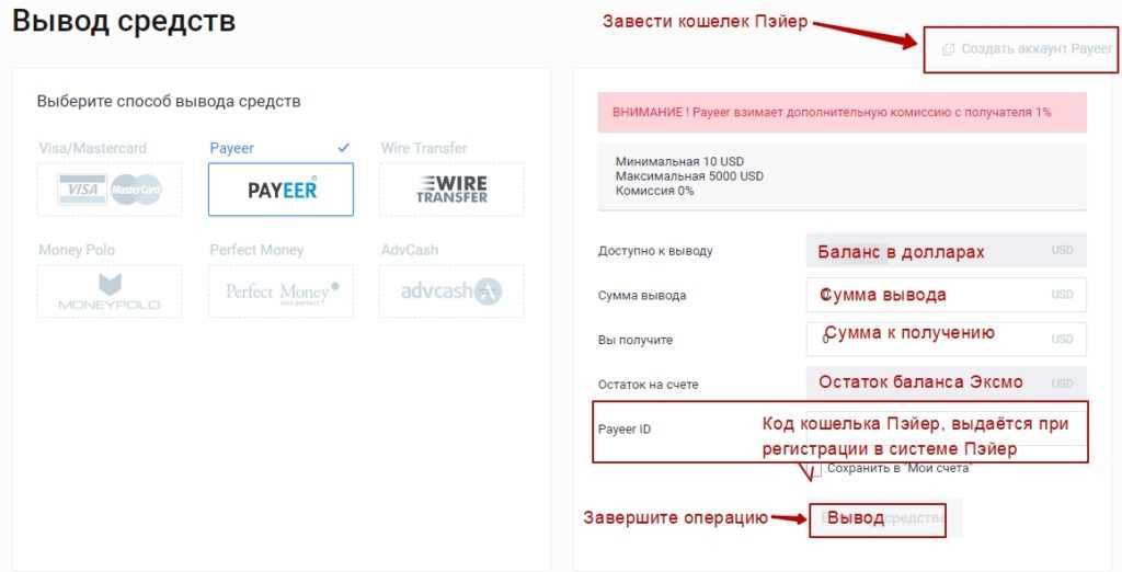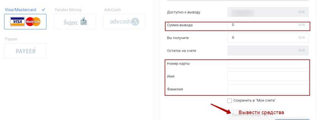 Заполните поле Сумма Вывода, имя и фамилию, сохраните данные, нажмите Вывести средства.