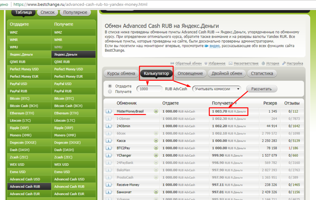В результате обнаружится, что в направлении Adv Cash — Яндекс Деньги через веб-обмен mistermoneybrasil вы получите на 0,37% больше, чем выводите. Это не розыгрыш, просто в обменных пунктах есть скидка зарегистрированным клиентам или на сумму операции.