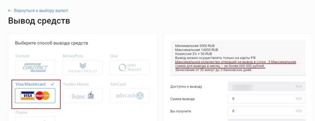 Тут важно обратить внимание на лимиты. Например, максимальная сумма вывода на Qiwi для не верифицированного пользователя составляет 15 000 р, а минимальная 1000р (Яндекс.Деньги на бирже не поддерживаются). При этом комиссии для различных платёжных систем могут отличаться