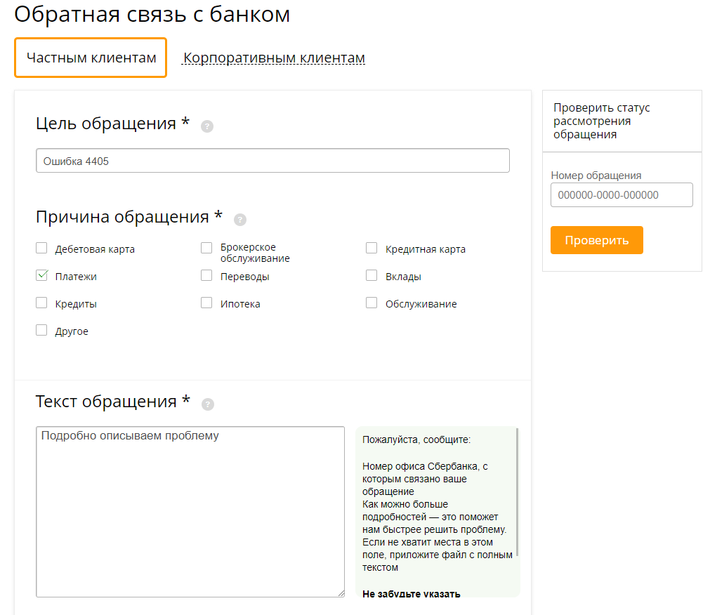 Еще об ошибках Обращение рассмотрят в финансовой организации в течение месяца с момента подачи. Но в случае ошибки 4405 обычно все происходит быстрее. После обращения менеджеры связываются с клиентом, фиксируют отмену транзакции, подсказывают, в чем причина ошибки и как решить проблему.