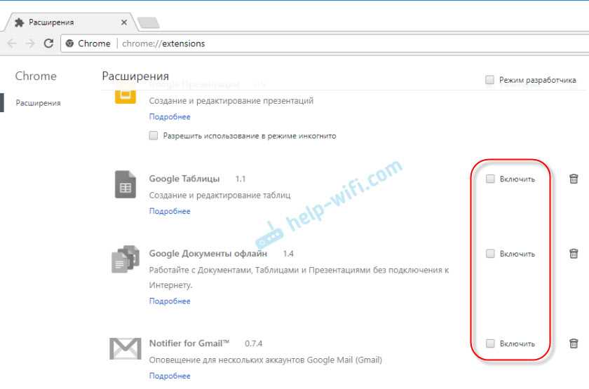 Так же временно отключите все расширения. Для этого зайдите в «Меню» – «Дополнительные инструменты» – «Расширения» и снимите галочки возле всех установленных расширений.