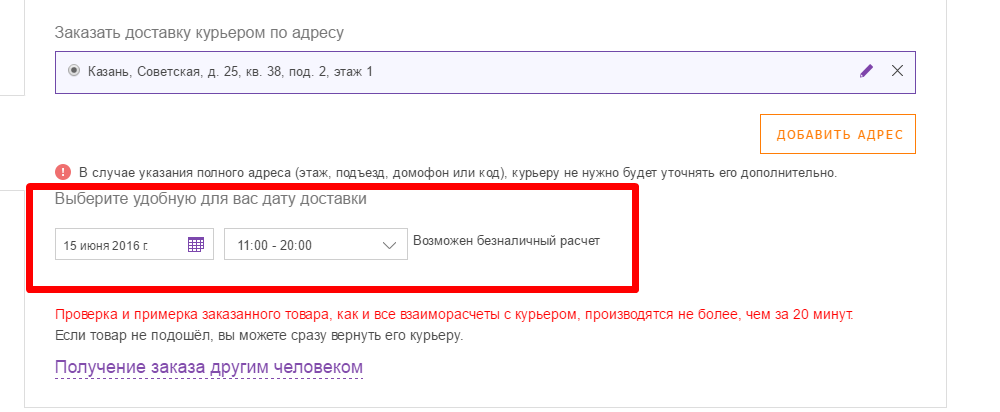 Проверка и примерка, расчет с курьером должны быть выполнены не более чем за 20 минут. В пунктах выдачи эти процедуры не ограничиваются по времени.