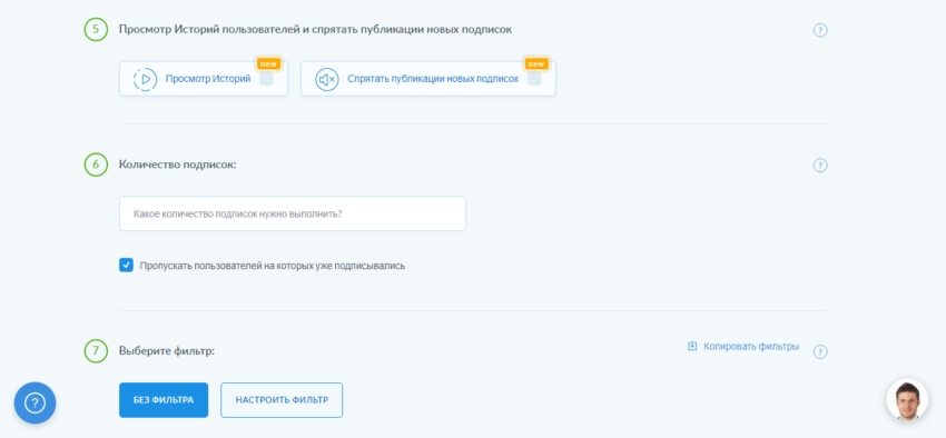 После успешной регистрации потребуется только добавить свой аккаунт от инстаграма и создать новое задание на автоматическую подписку с выбранным критерием.