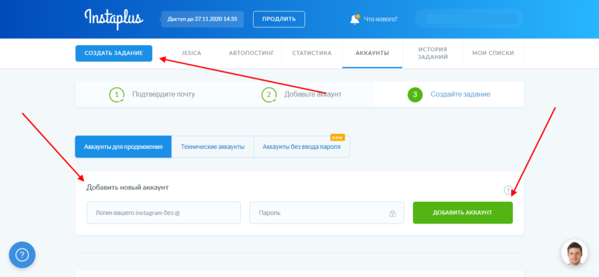 - Подтверждаем почту и возвращаемся на сервис. Там кликаем по кнопке «Создать задание» и в нижней части экрана добавляем свой аккаунт от инстаграма. Заполняем данные и нажимаем на кнопку «Добавить аккаунт».
