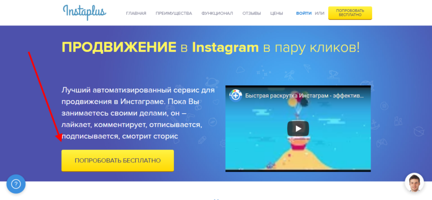 - Открываем официальную страницу Instaplus.me сервиса и на первом экране кликаем по кнопке «Попробовать бесплатно». После этого будет открыто окно регистрации – в нем вводим привычные нам данные и следуем далее.