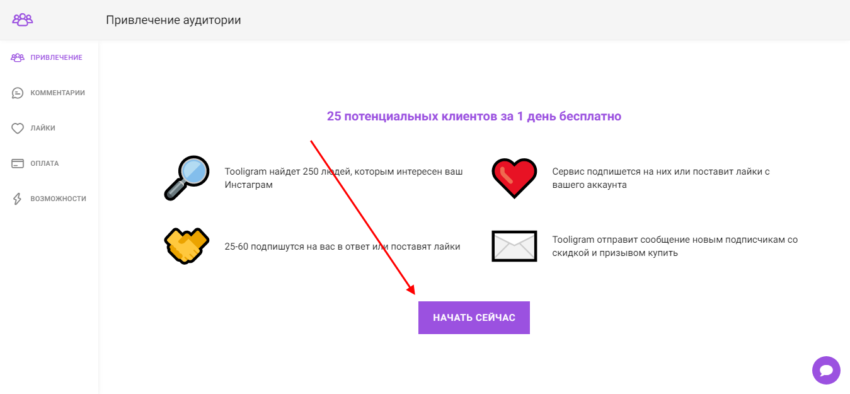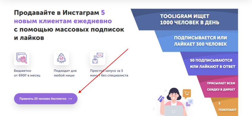 Последний сервис, о котором мы расскажем – это Tooligram. С его помощью можно бесплатно привлечь до 25 человек на свой аккаунт с помощью массовых подписок и лайков. Давайте рассмотрим, как им можно воспользоваться: