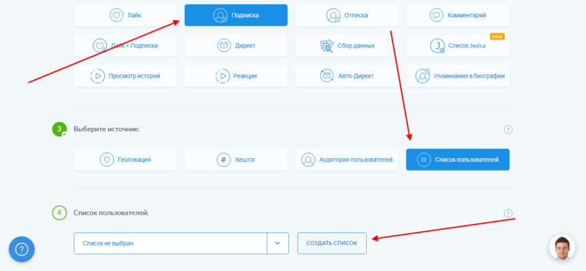 - В отобразившемся окне перед нами отображен список доступных функций, нас же интересует только одна — «Подписка». Выбираем ее, затем указываем источник, на который будет ссылаться сервис во время подписок. Для примера возьмем свой список пользователей – в таком случае будет проведена полная подписка на всех нужных пользователей, которых мы добавим в пункте «4».