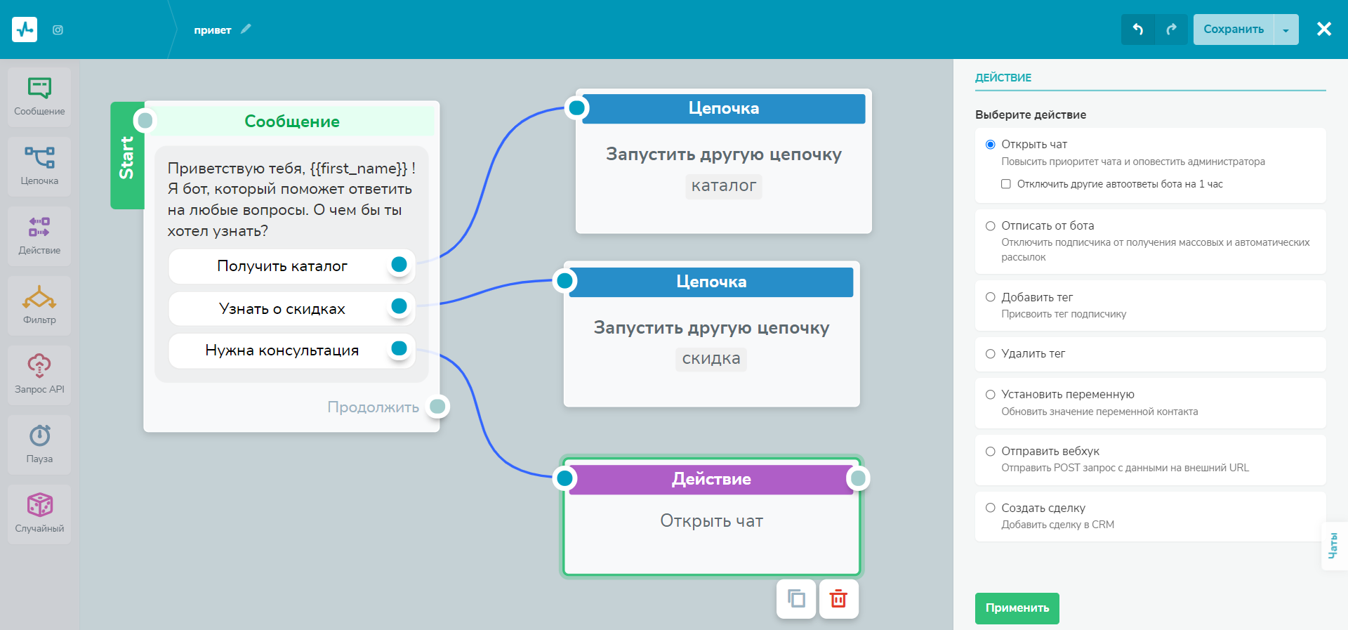 Бот от SendPulse позволяет настроить ответы на часто задаваемые вопросы, создавать любые цепочки, отправлять данные в CRM, оформлять заказы и уведомлять клиентов о доставке.