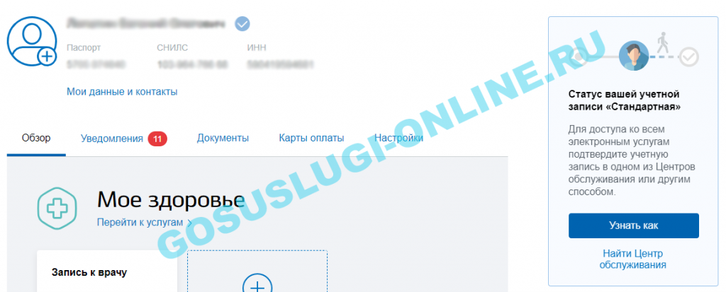 Однако, чтобы иметь доступ к расширенному перечню услуг, необходимо заполнить анкету более подробными персональными данными, к ним относят серию и номер документа, удостоверяющего личность (паспорт РФ или паспорт иностранного гражданина) и номер СНИЛС. После выявления факта достоверности заполненных сведений, на электронную почту будет доставлено письмо с уведомлением о результате. После этого станет доступна стандартная учетная запись. На этой стадии будут доступны такие услуги, как проверка задолженности по налогам и сборам, получение выписки о состоянии счета в ПФ РФ.