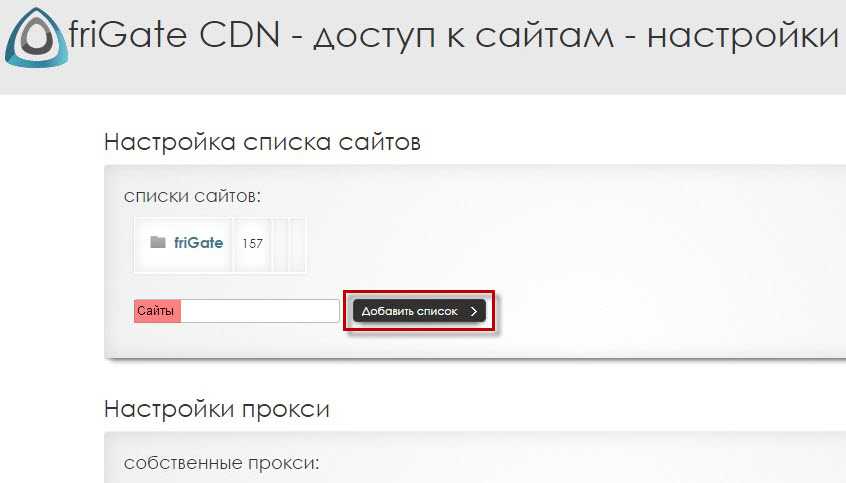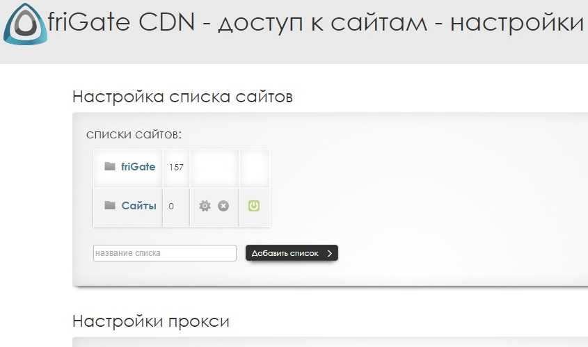 В настройках списка сайтов, вы увидите, что ранее уже был создан глобальный список friGate, в который включено некоторое количество сайтов. Вы можете создать свой собственный пользовательский список, или несколько списков, если вам так удобнее.
