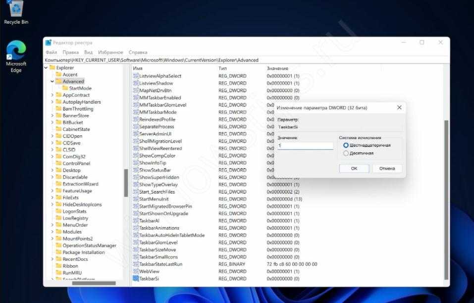 - Перейдите к определенной ветке реестра. За изменение значков в панели задач Windows 11 отвечает путь HKEY_CURRENT_USERSoftwareMicrosoftWindowsCurrentVersionExplorerAdvanced.