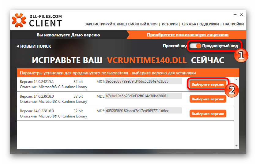 А если вам потребуется определенная DLL, то тут предусмотрена и такая возможность. У данного программного обеспечения есть переключатель режима: воспользовавшись им, вы увидите различные версии файлов и сможете выбрать себе необходимую. Это может понадобиться, если вы установили одну библиотеку, но ошибка все еще присутствует. Нужно попробовать иную версию, и возможно она как раз подойдет для вашей ситуации. Вот что потребуется для этого: